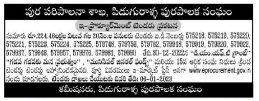 Tender of works are 575218.575219,575220, 575221, 575223. 575224. 575225, 579748, 579756, 579762, 579918, 579919, 579920, 579922. 579987, 579948, 579957, 579976. 579981, 579990 తేది. On 30-12-2022 tenders are invited under DMFT Grant Gadapa Gadapaku Mana Govt, Municipal General Funds and 15th Financial Union Funds.