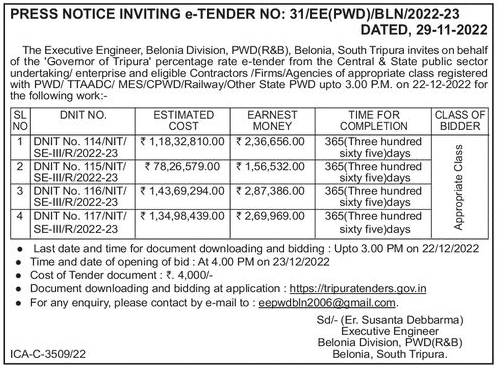 Tender for DNIT No. 117/NIT/SE-III/R/2022-23