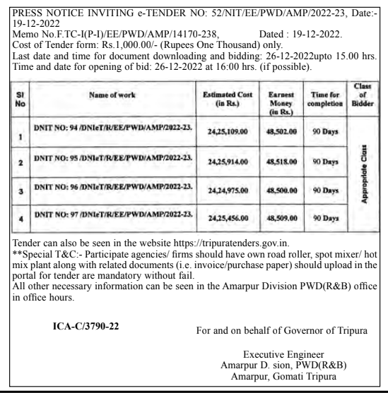 Tender for DNIT NO: 94/DNIeT/R/EE/PWD/AMP/2022-23.