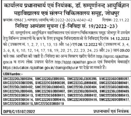 Tender for Dr.Sampurnanand Medical College and attached hospital group, Jodhpur on 14.12.2022 (Equipment No. 1, 2, 7, 11, 13, 15 and 16)