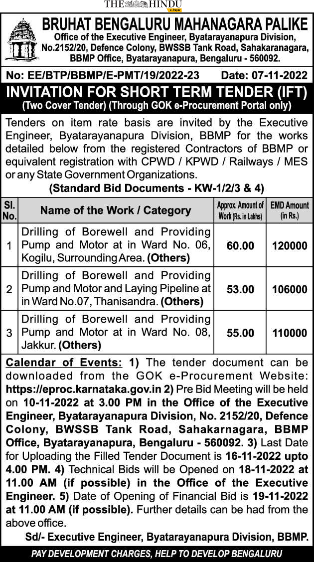 Drilling of Borewell and Providing 2 Pump and Motor and Laying Pipeline at in Ward No.07, Thanisandra.