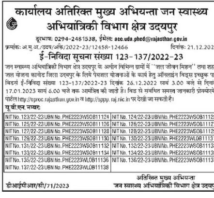 Tender for drinking water schemes for “Jal Jeevan Mission” and Shah Jal Yojana Kanod district Udaipur in various villages under Public Health Engineering Department area Udaipur