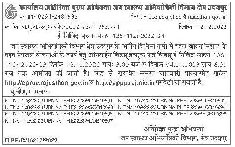 Tender for drinking water schemes under Jal Jeevan Mission in various villages under Public Health Engineering Department area Udaipur E-tender number 106- 1127 2022-23