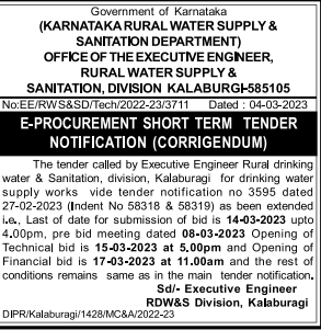 Tender for drinking water supply works vide tender notification no 3595 dated 27-02-2023 (Indent No 58318 & 58319)