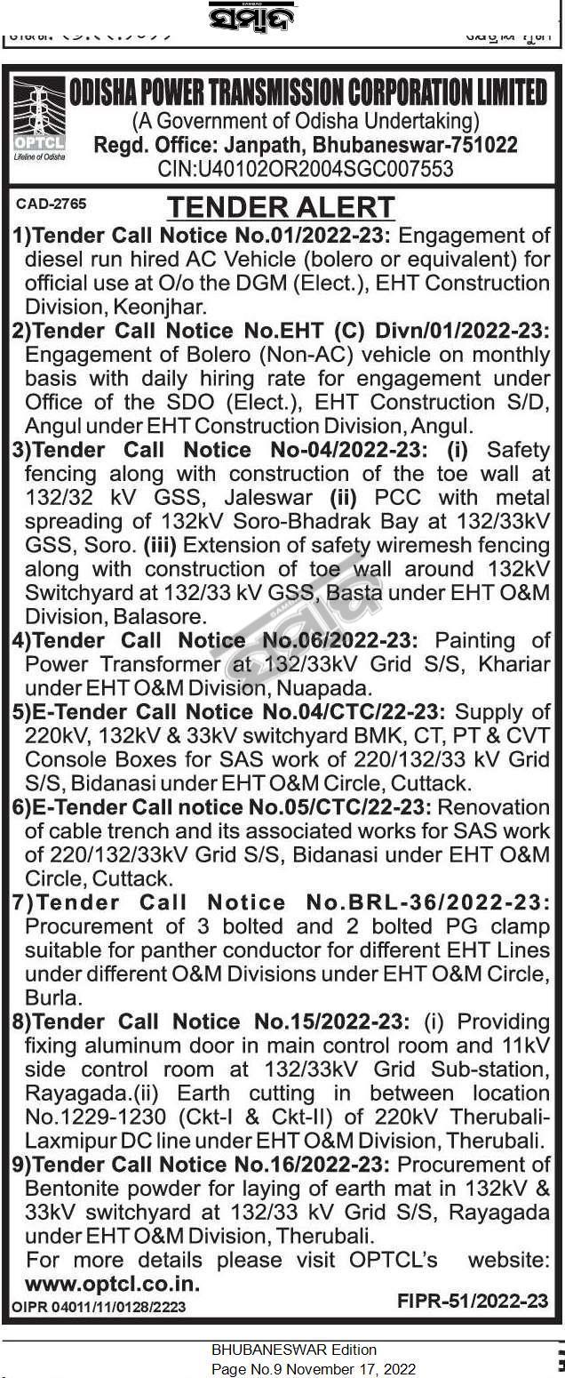 Tender For E-Tender Call notice No.05/CTC/22-23: Renovation of cable trench and its associated works for SAS work of 220/132/33kV Grid S/S, Bidanasi under EHT O&M Circle, Cuttack.