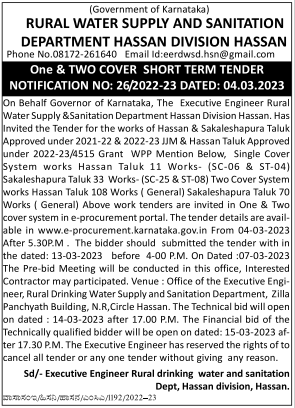 Tender for e works of Hassan & Sakaleshapura Taluk Approved under 2021-22 & 2022-23 JJM & Hassan Taluk Approved under 2022-23/4515 Grant WPP Mention Below, Single Cover System works Hassan Taluk 11 Works- (SC-06 & ST-04) Sakaleshapura Taluk 33 Works- (SC-25 & ST-08) Two Cover System works Hassan Taluk 108 Works (General) Sakaleshapura Taluk 70 Works (General)