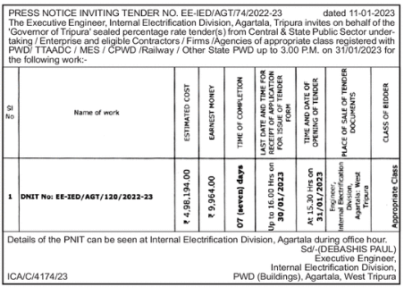 Tender for EARNEST MONEY The Executive Engineer, Internal Electrification Division, Agartala, Tripura invites on behalf of the ‘Governor of Tripura’ sealed percentage rate tender(s) from Central & State Public Sector DNIT NO: EE-IED/AGT/120/2022-23