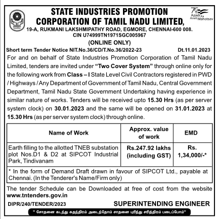 Tender for Earth filling to the allotted TNEB substation plot Nos.D1 & D2 at SIPCOT Industrial Park, Tindivanam