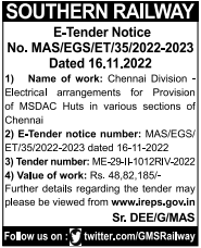 Chennai Division – Electrical arrangements for Provision of MSDAC Huts in various sections of