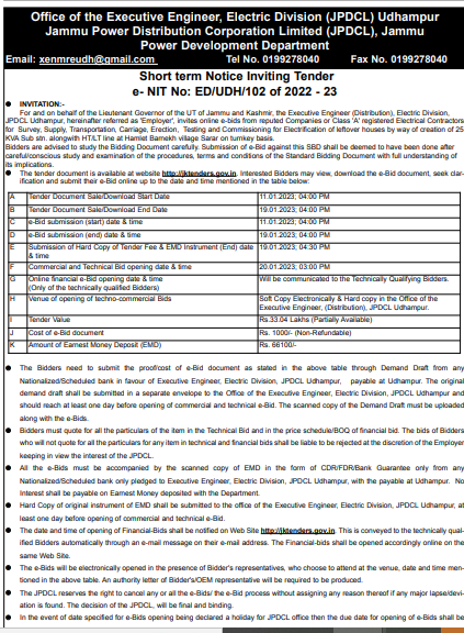 Tender for Electrical Contractors for Survey, Supply, Transportation, Carriage, Erection, Testing and Commissioning for Electrification of leftover houses by way of creation of 25 KVA Sub st. alongwith HT/LT line at Hamlet Bamekh village Sarar on turkey basis.