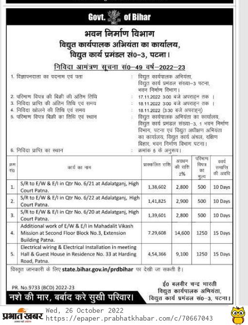 Electrical wiring & Electrical Installation in meeting Hall & Guest House in Residence No. 33 at Harding Road, Patna.