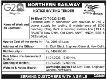 Tender for Electrical work in connection with provision of 750 V power supply for testing & maintenance of EOG coaching rolling stack at washing line/sick line (DLT & RAJ/STB New Delhi, Old Delhi, ANVT, HNZM, SSB & DEE station).