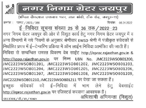 Tender for electrical work in Municipal Corporation Greater Jaipur and other departments in e-tendering process in the prescribed form from registered EWSD category category