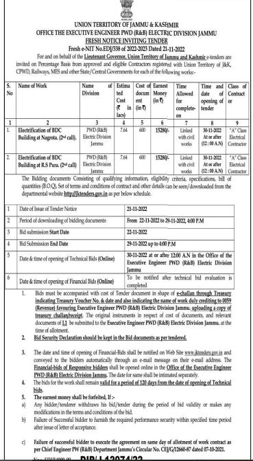 Tender for Electrification of BDC Building at RS Pura. (2 call) PWD(R&B) Electric Division