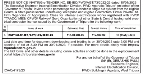 Tender for electrification works registered with PWD/ TTAADC/ MES/ CPWD/ Railway/ Govt. Organization of other State & Central having valid elec- trical contractor license issued by the Goverment DNIT NO.EE-IED/AGT/119/2022-23
