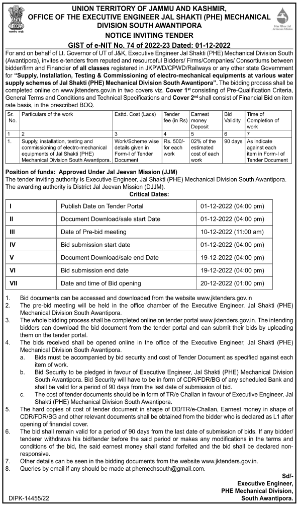 Supply, installation, testing and commissioning of electro-mechanical equipments of Jal Shakti (PHE) Mechanical Division South Awantipora.