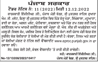 Tender for eligible bidders listed with Punjab Mandi Board for upgradation and strengthening of seas (civil works, public health and electrical works).