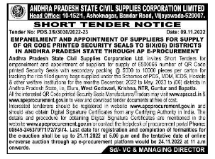 Tender for empanelment and appointment of suppliers for supply of 6500C66 number of QR Code priited Security Seals with secondary packing 5000 to 10000 pieces per carton