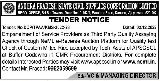 Tender for Empanelment of Service Providers as Third Party Quality Assaying Check of Custom Milled Rice accepted by Tech. Assts of APSCSCL Agency through NeML e-Reverse Auction Platform for Quality test at Buffer Godowns in CMR Procurement Districts.