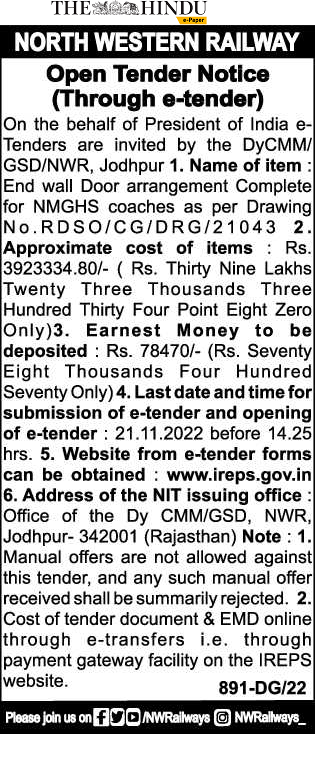 Tender for End wall Door arrangement Complete for NMGHS coaches