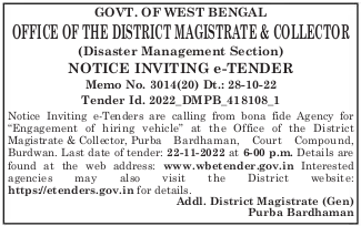 Tender for “Engagement of hiring vehicle” at the Office of the District Magistrate & Collector, Purba Bardhaman, Court Compound, Burdwan.