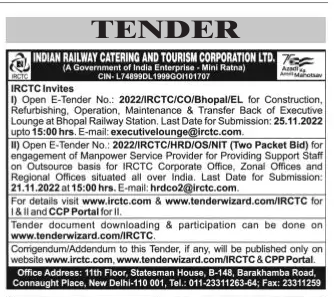 Tender for engagement of Manpower Service Provider for Providing Support Staff on Outsource basis for IRCTC Corporate Office, Zonal Offices and Regional Offices situated all over India.