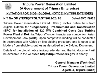 Tender for Engineering, Procurement and Construction (EPC) for Installation of 120 MW Combined Cycle Gas Turbine Power Plant at Rokhia, Tripura
