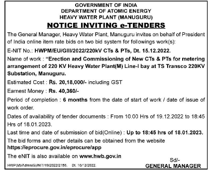 Tender for “Erection and Commissioning of New CTs & PTs for metering arrangement of 220 KV Heavy Water Plant(M) Line-I bay
