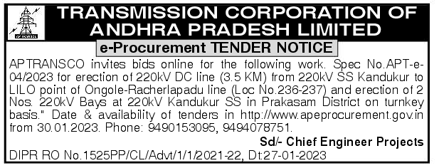 Tender for erection of 220kV DC line (3.5 KM) from 220kV SS Kandukur to LILO point of Ongole-Racherlapadu line (Loc No.236-237) and erection of 2 Nos. 220kV Bays at 220kV Kandukur SS in Prakasam District on turnkey basis.