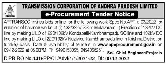 APTRANSCO invites bids online for the following work Spec No.APT-e-03/2022 for erection of balance works at (1) 132/33kV SS at Mylavaram ii) Erection of 132kV DC line by making LILO of 220/132kv Kondapalli-Kambhampadu SC line and 132kV DC line by making LILO of 220/132kV Nuzividu-Kambhampadu line in Krishna District