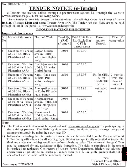 Tender for Erection of Fencing of 25.0 ha. Block Plantation (AR)