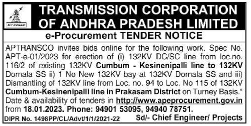 APTRANSCO invites bids online for the following work. Spec No. APT-e-01/2023 for erection of (i) 132KV DC/SC line from loc.no. 116/2 of existing 132KV Cumbum – Kesinenipalli line to 132KV Dornala SS ii) 1 No New 132KV bay at 132KV Dornala SS and iii) Dismantling of 132KV line from Loc. no. 94 to Loc. No 115 of 132KV Cumbum-Kesinenipalli line in Prakasam District on Turney Basis.