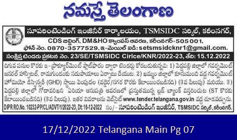 Tender for Establishment of facilities for Government General Hospital, Ramagundam in Peddapally District. 2) Upgradation of Government Homeo Dispensary (GHD) at Kusumanchi in Khammam District (allocated for Vaddera / Sagara) (3rd Call)