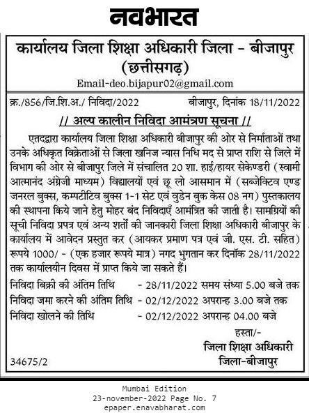 Tender for establishment of library (subjective and general books, competitive books 1-1 set and wooden book case 08 nos.) in High/Higher Secondary (Swami Atmanand English medium) schools and Chhu Lo Aasman.