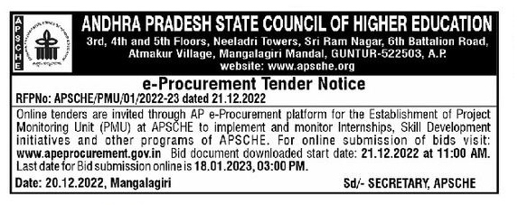 AP e-Procurement platform for the Establishment of Project Monitoring Unit (PMU) at APSCHE to implement and monitor Internships, Skill Development initiatives and other programs of APSCHE.