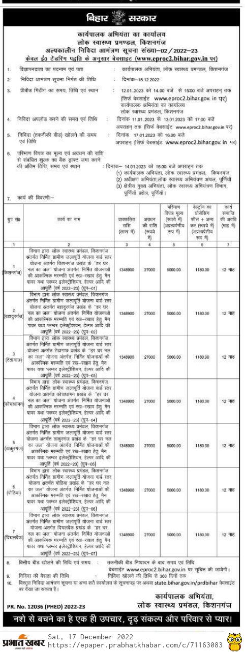 Tender for Every household in Thakurganj block has taps under the Ward Level Scheme under the Rural Water Supply Scheme built by the Department under the Public Health Division, Kishanganj. Supply of manpower such as plumber, electrician, helper etc. for emergency repair and maintenance of schemes constructed under Ka Jal Yojana (Year 2022-23) (Group-06)