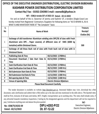 Tender for Exchange of old Brass Bush rod of sizes with Fresh bush rod of sizes with in Divisional Stores.