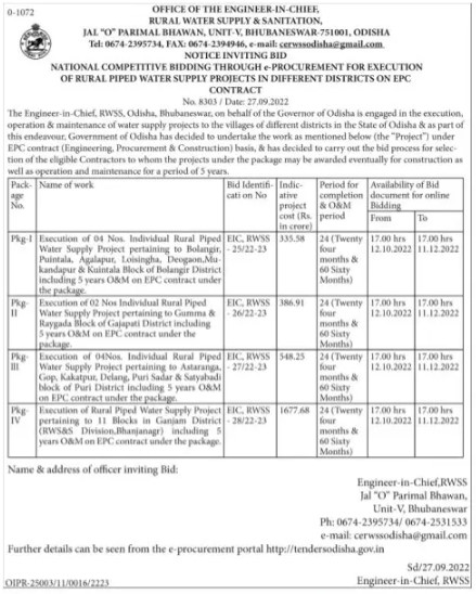 Tender for Execution of 01 Not Individual Rural Piped Water Supply Project pertaining to Bolangir Paintala, Agalapur, Loisingha, Deogaon.Mu kandapur & Kuintala Block of Bolangir District including 5 years O&M on EPC contract under the package