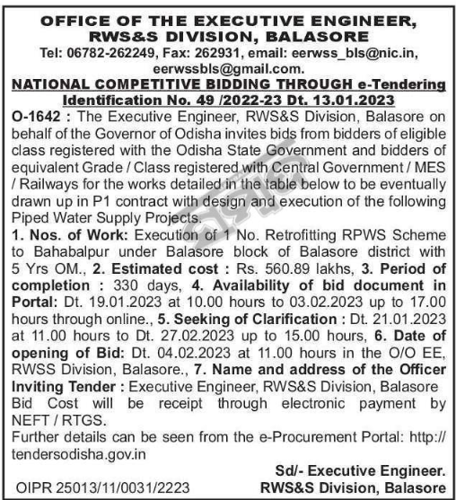 Tender for Execution of 1 No. Retrofitting RPWS Scheme to Bahabalpur under Balasore block of Balasore district with 5 Yrs OM., 2. Estimated cost: Rs. 560.89 lakhs, 3. Period of completion 330 days