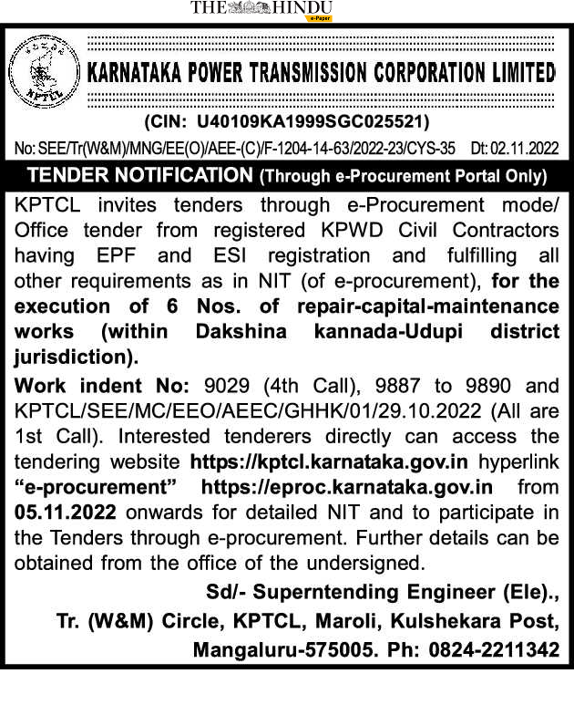 Tender for execution of 6 Nos. of repair-capital-maintenance works (within Dakshina kannada-Udupi district jurisdiction).