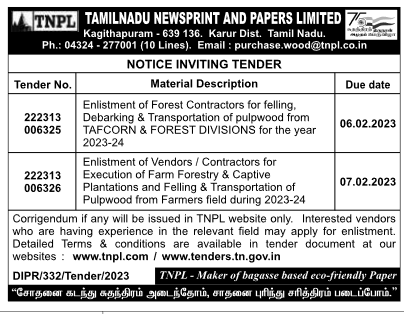 Tender for Execution of Farm Forestry & Captive Plantations and Felling & Transportation of Pulpwood from Farmers field during 2023-24