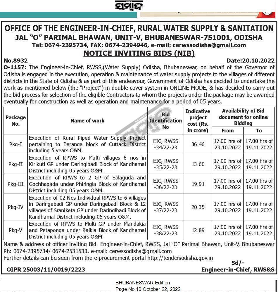 Execution of RPWS to Multi GP under Mandakia and Petaponga under Raikia Block of Kandhamal District including 05 years O&M.