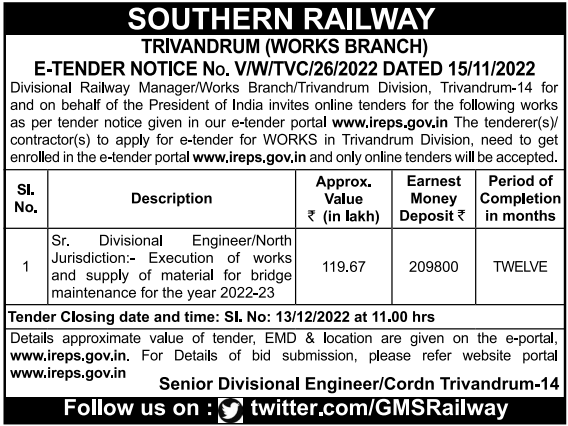 Sr. Divisional Engineer/North Jurisdiction:- Execution of works and supply of material for bridge maintenance for the year 2022-23