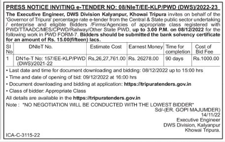 Tender for Executive Engineer, DWS Division Kalyanpur, Khowai Tripura.