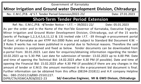 Tender for Executive Engineer, Minor Irrigation and Ground Water Development Division, Chitradurga, out of the 15 works (works of Package-1,2,3,4,5,6,11,12 & 13)