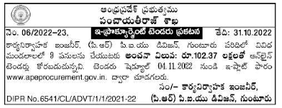 Tender for Executive Engineer, (PR) PIU Division, Guntur Area for execution of 9 works in various mandals
