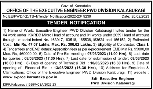 Tender for Executive Engineer PWD Division Kalaburagi Invites tender for the 04 work under KKRDB Micro Head of account and 01 works under 2059 Head of account through e-portal Indent No. 163917,163518, 165538,163624 and 166152,