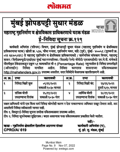 TENDER FOR EXECUTIVE ENGINEER (WEST) DEPARTMENT, MUMBAI SLUME REFORMATION BOARD (A COMPONENT OF MAHARASHTRA HOUSING AND AREA DEVELOPMENT AUTHORITY) ROOM NO. 537, 4th Floor, Housing Building, Bandra (East), Mumbai