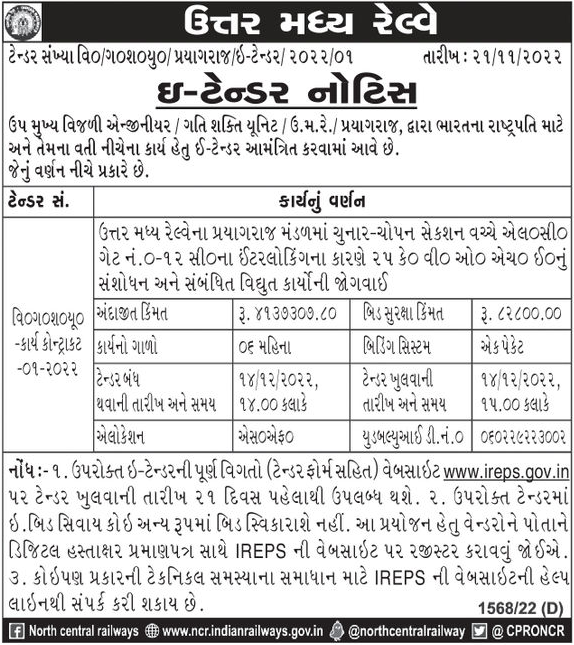 Tender for Exploration of 25 K0 V0 O0 H0 E and provision of related electrical works due to interlocking of LC Gate No.0-12 C0 between Chunar-Chopan Section in Prayagraj Mandal of North Central Railway