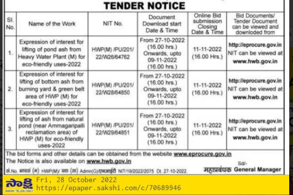 Tender for Expression of interest for lifting of ash from natural pond (near Ammagaripalli reclamation area) of HWP (M) for eco-friendly uses-2022
